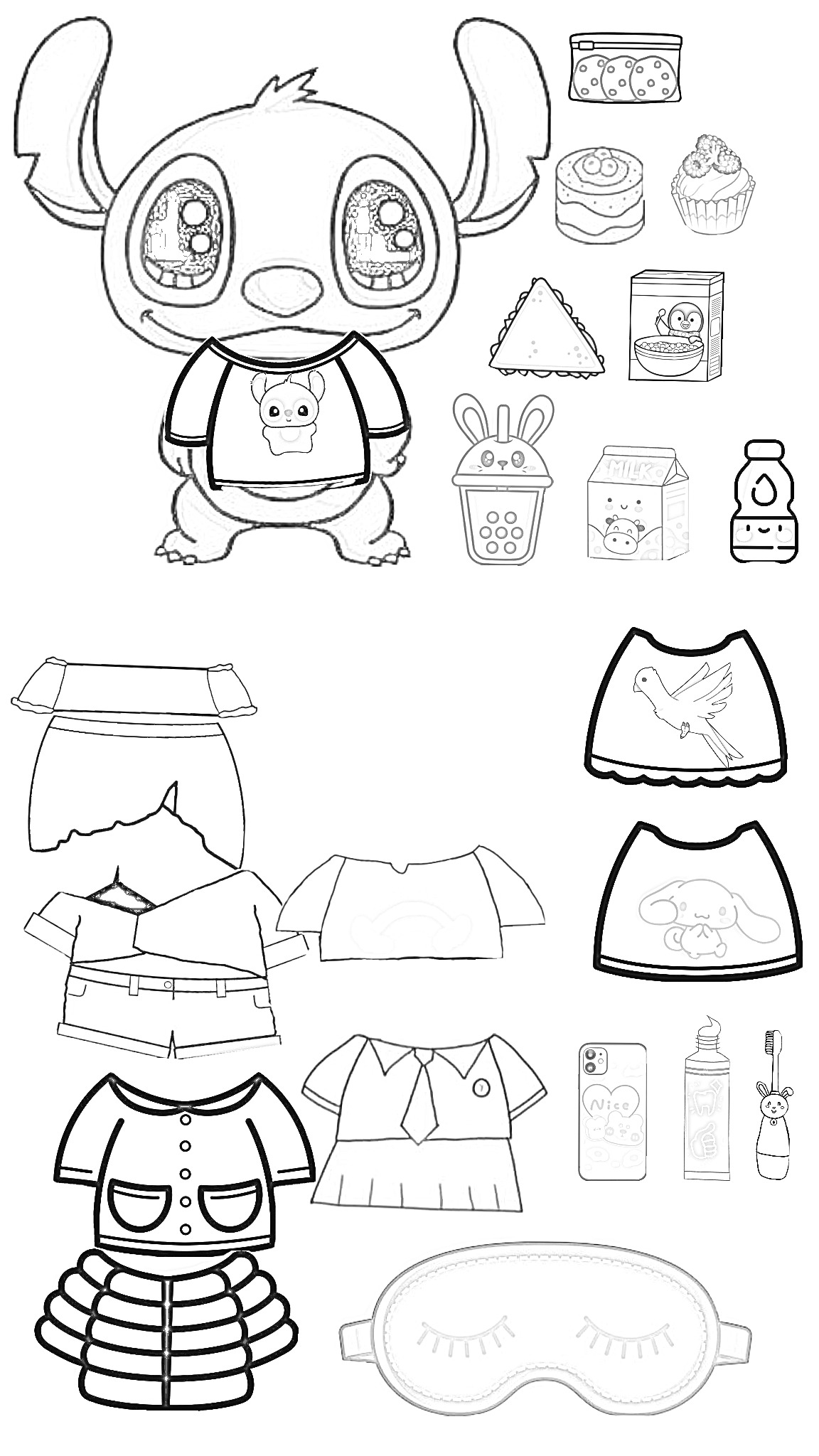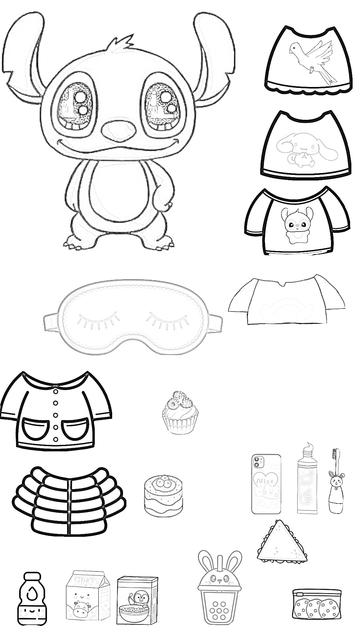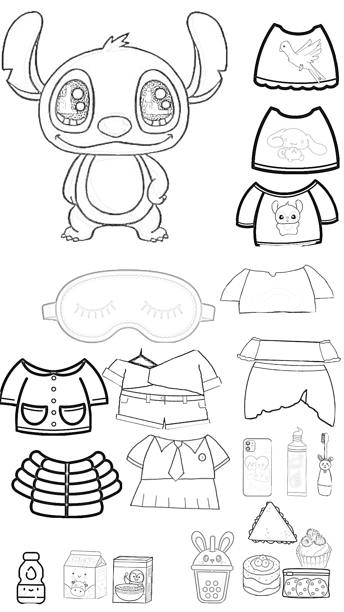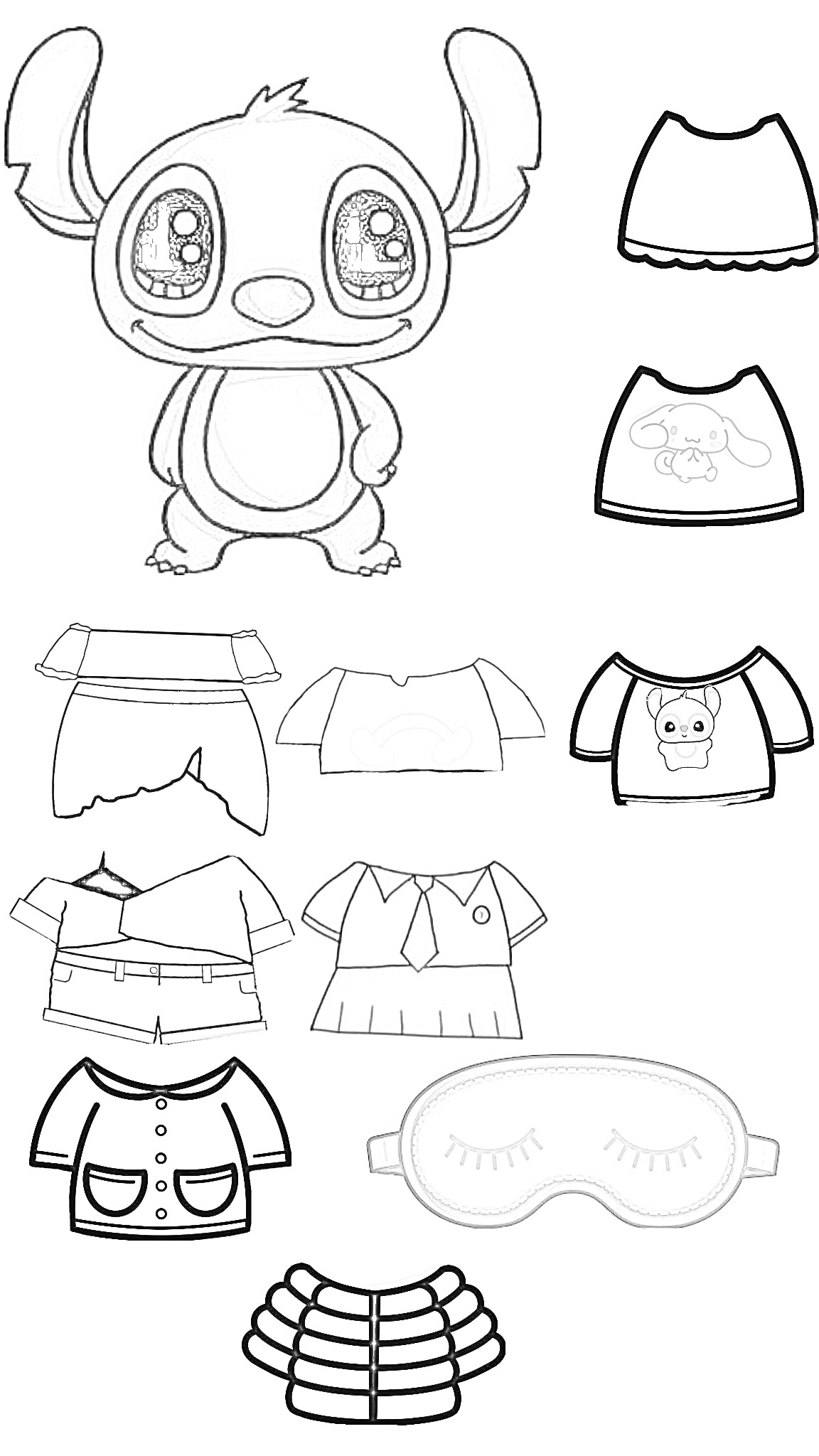 Подборка раскрасок Стича с одеждой и аксессуарами, которые вы можете скачать и раскрашивать. Так же можешь посмотреть раскраски с Лабубой Стичем.