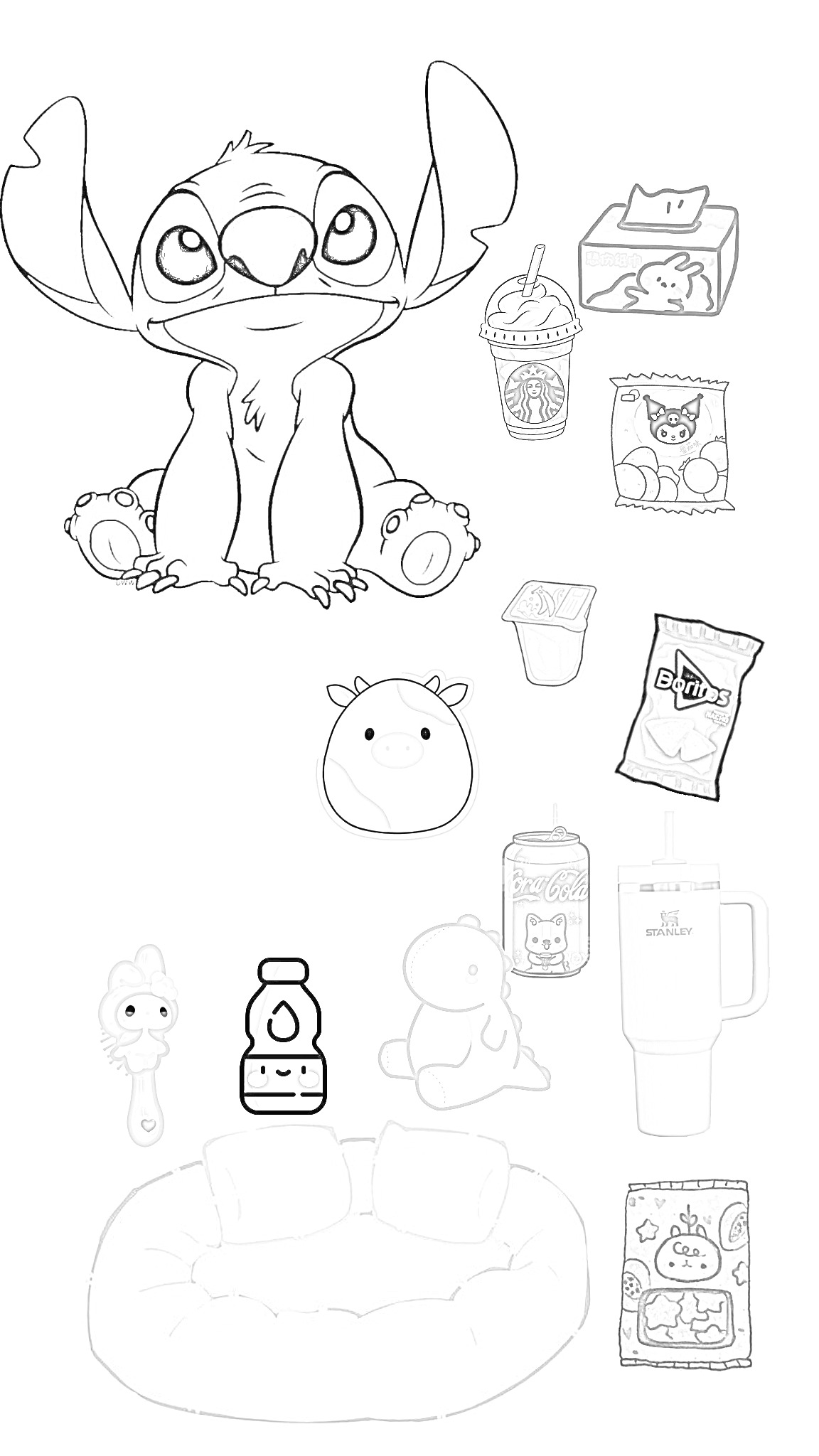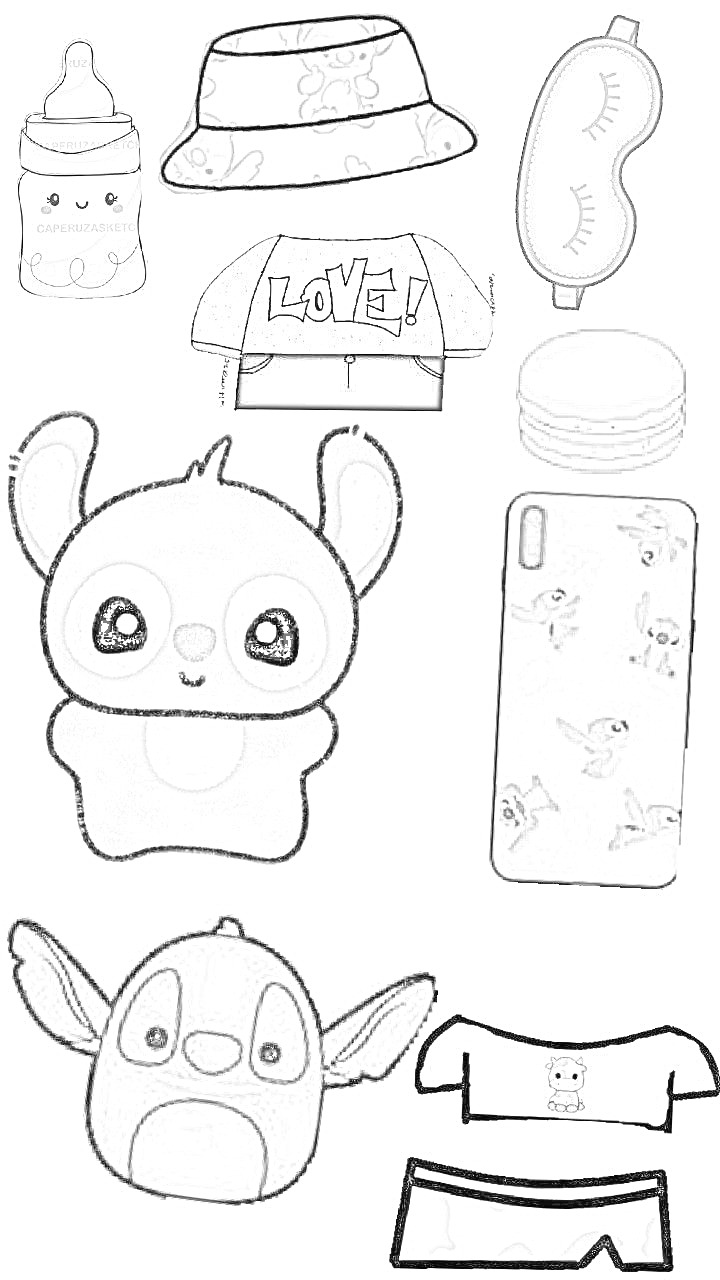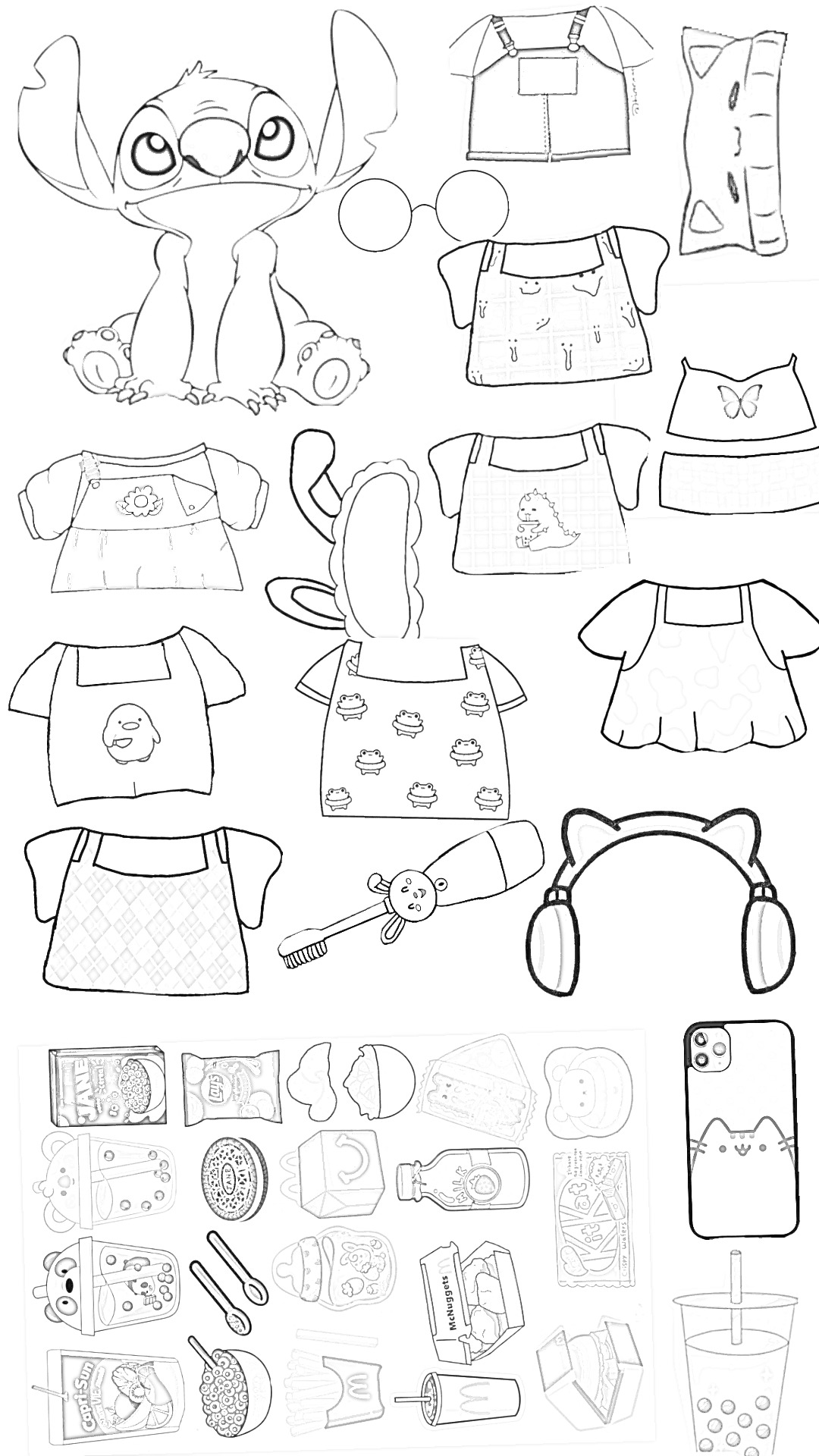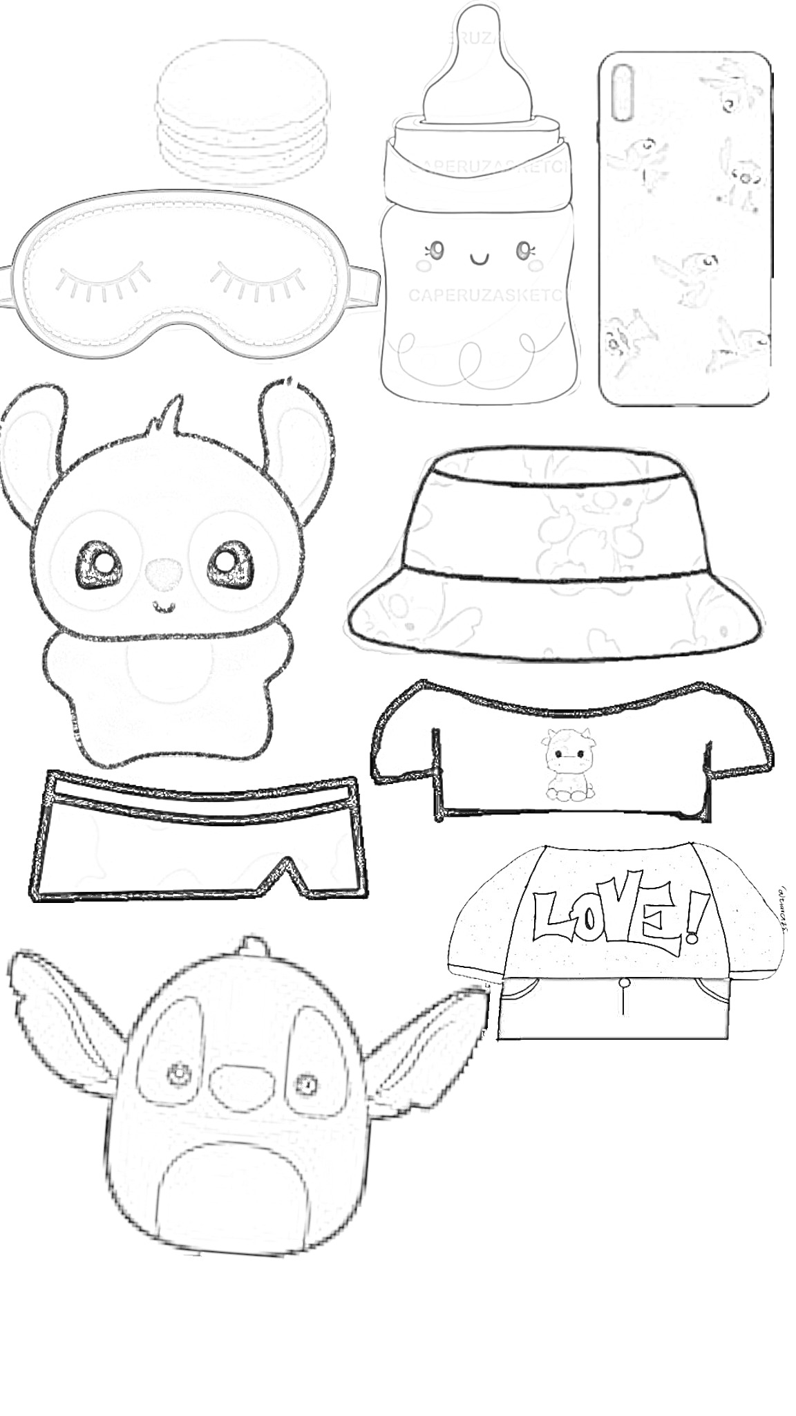 Подборка раскрасок Стича с одеждой и аксессуарами, которые вы можете скачать и раскрашивать. Так же можешь посмотреть раскраски с Лабубой Стичем.