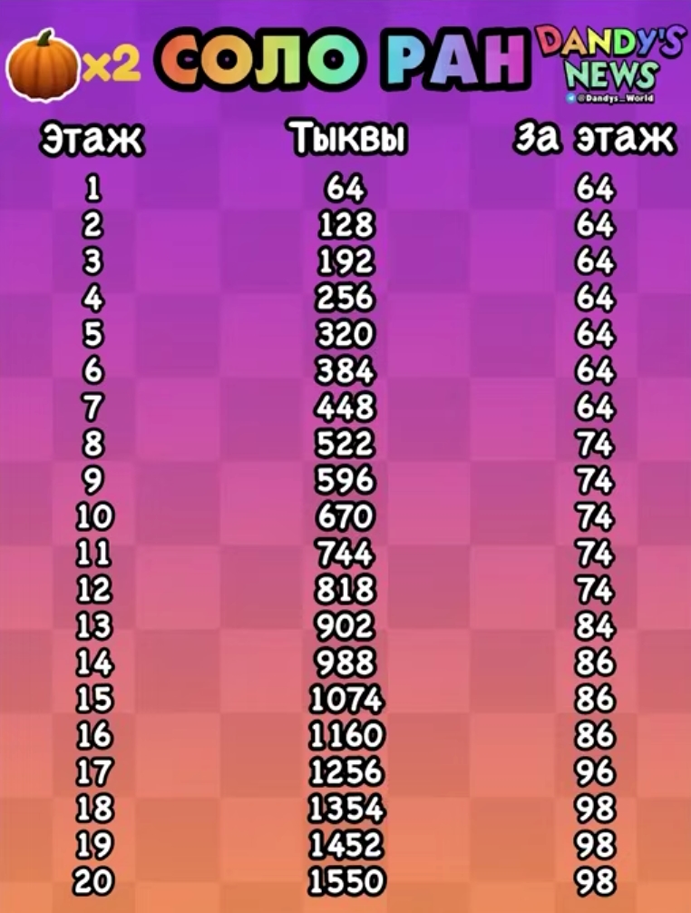 Если хочешь собрать максимум тыкв, играй в соло-режиме! Вот таблица по которой можно ориентироваться (таблица из тг – t.me/Dandys_World).