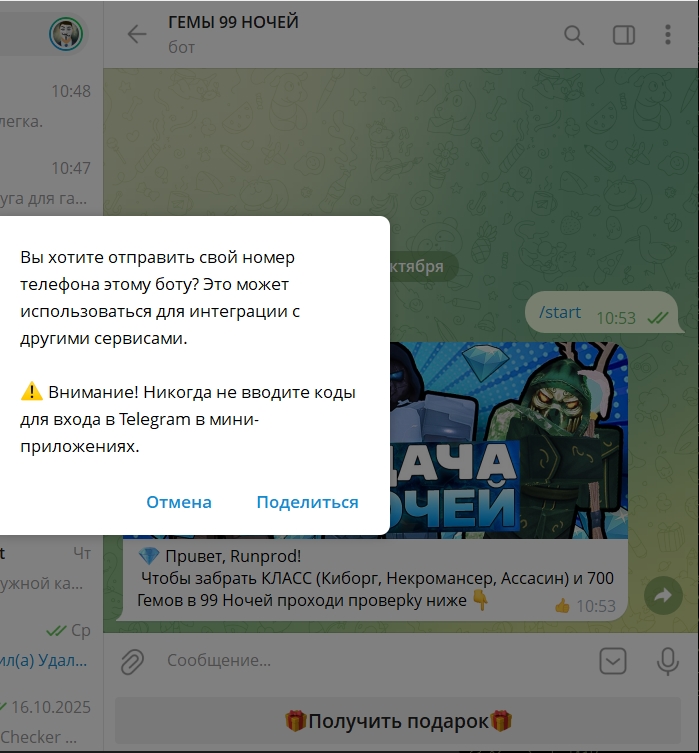 Так например вот пример телеграм канала с одним единственным постом где пользователей перенаправляли на бота который собирал реальные номера телефонов и другие конфиденциальные данные. Потом не удивляйтесь если Вам будут звонить мошенники или случайным образом на телефоне появиться платная подписка которую очень сложно отключить.