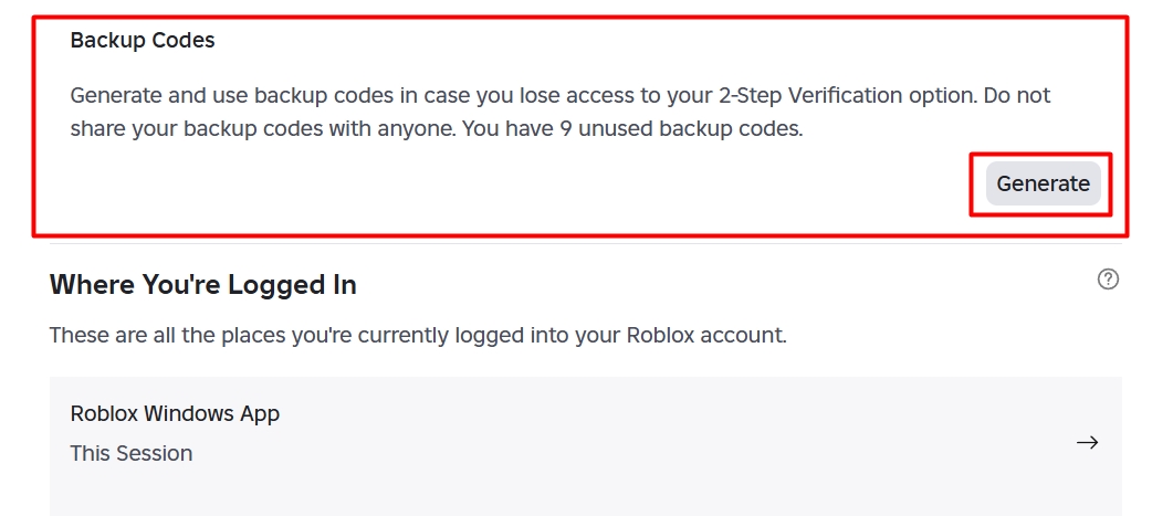 Резервные коды — это набор одноразовых кодов, которые Roblox выдаёт пользователю при настройке двухфакторной аутентификации (2-Step Verification). Они нужны на случай, если вы потеряли доступ к основному способу 2FA (например, к приложению-аутентификатору на телефоне) и не можете получить код обычным способом. Каждый резервный код используется один раз; при создании нового набора старые коды деактивируются.