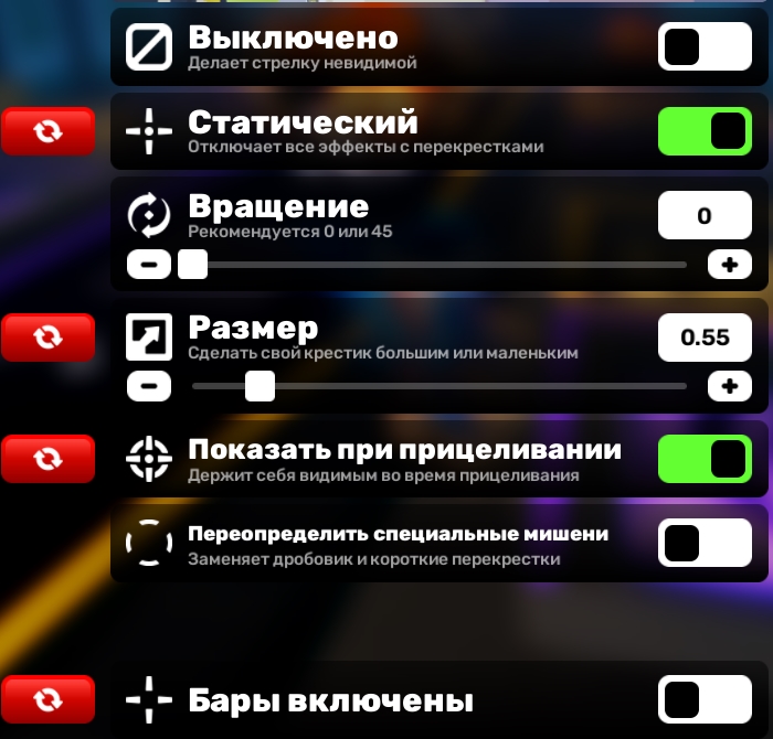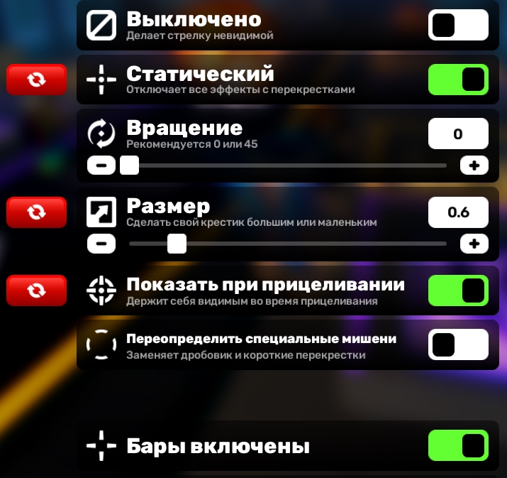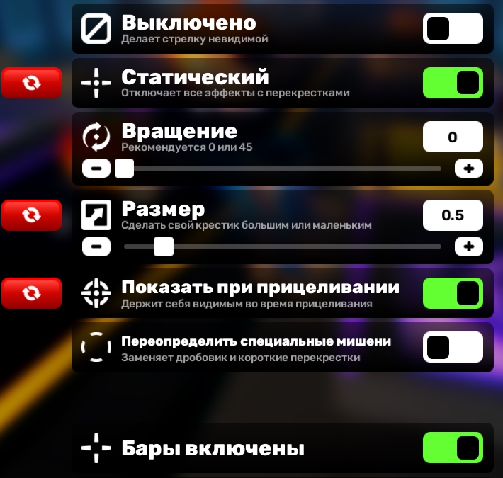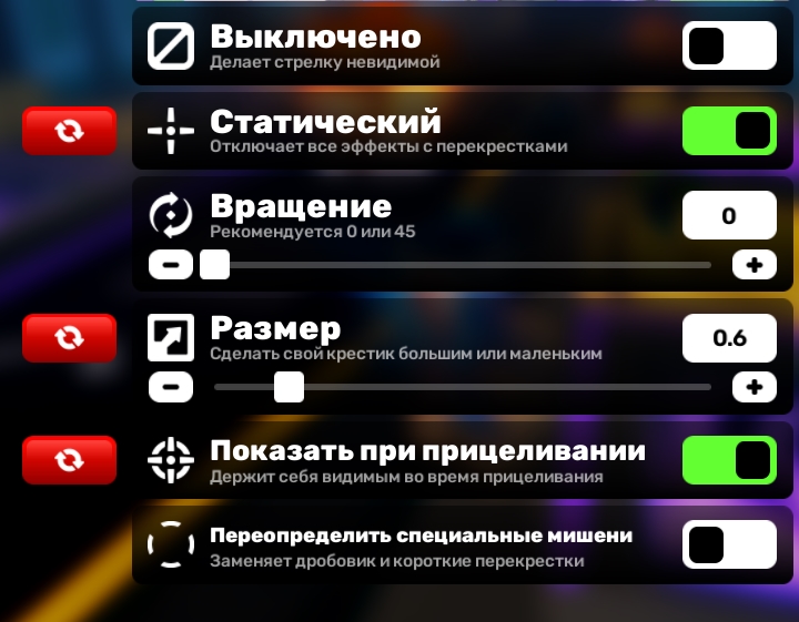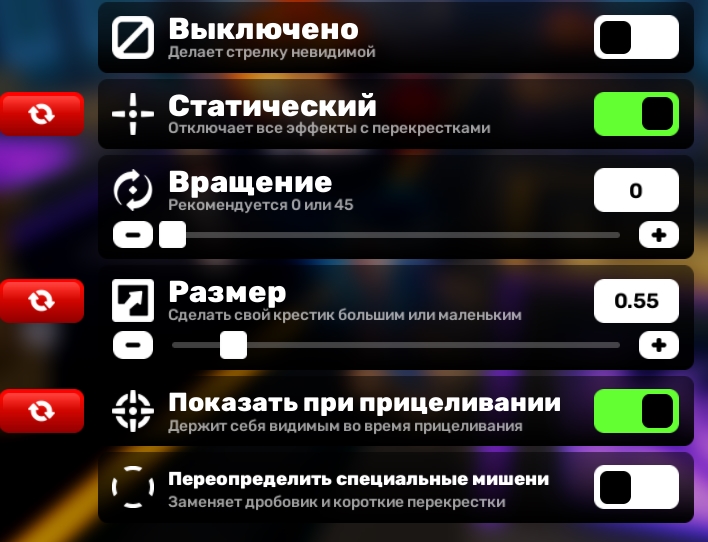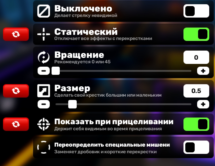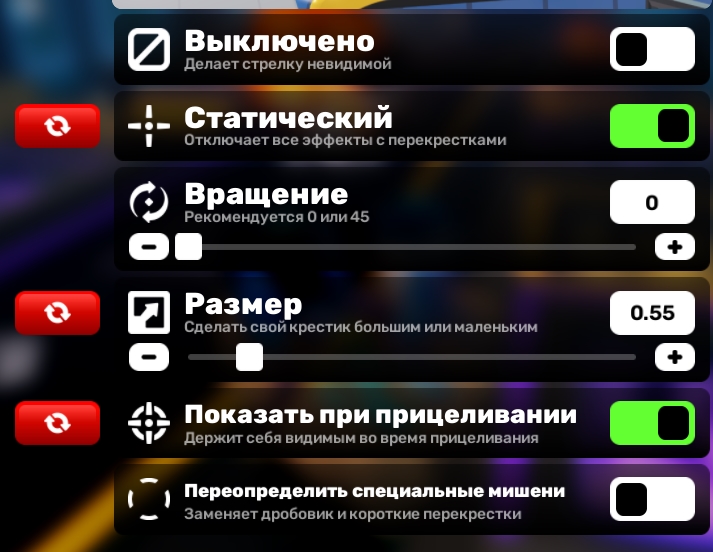 | Rotation | ❌ Отключено | Не даёт прицелу вращаться при стрельбе — это снижает визуальные помехи. |